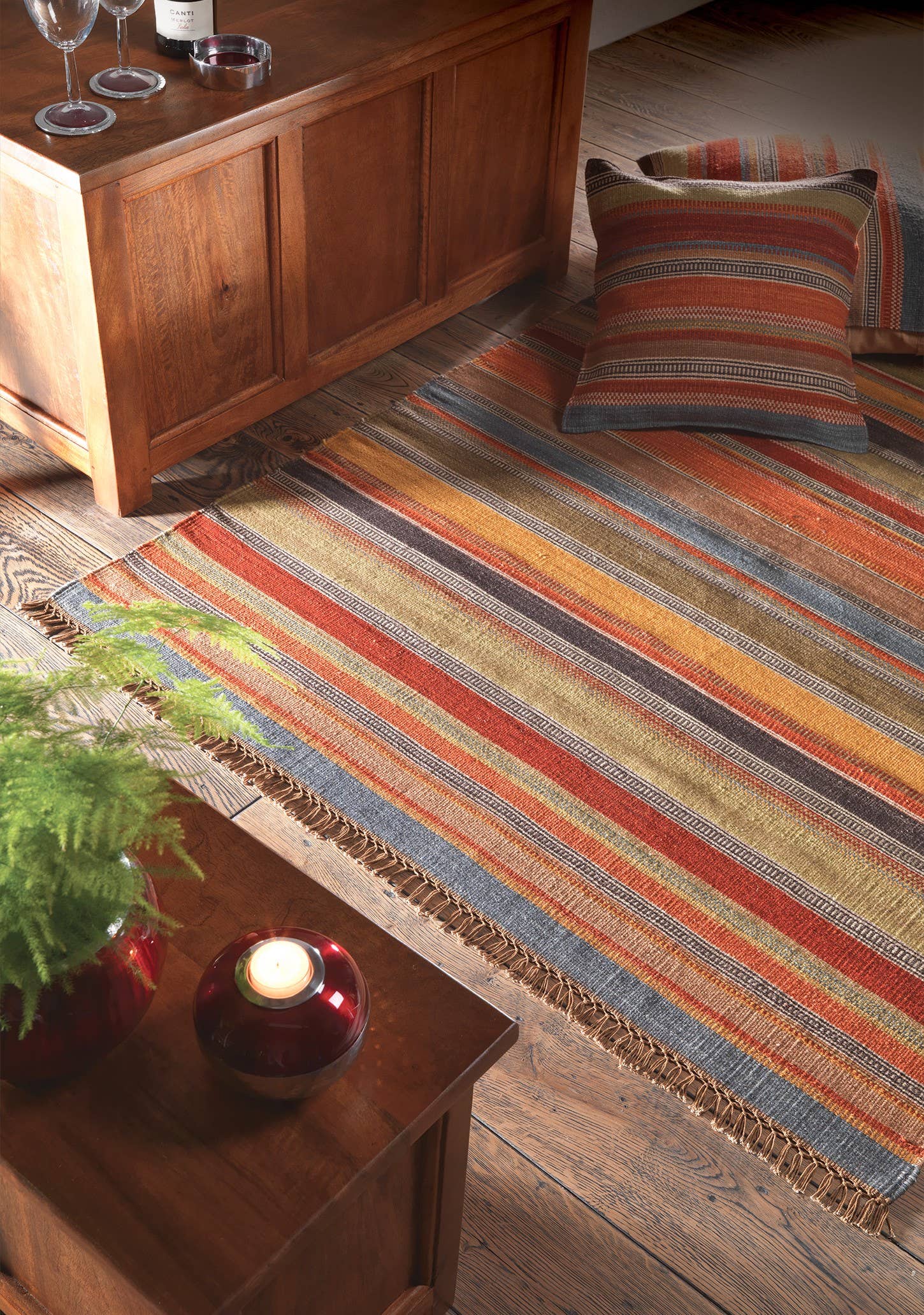 Ein hoher Wollanteil sorgt für Lebendigkeit und Farbtiefe und ermöglicht es auch, mehr Details in das Design zu integrieren, wie auf diesem Kelimteppich von Ooty Stripe.
